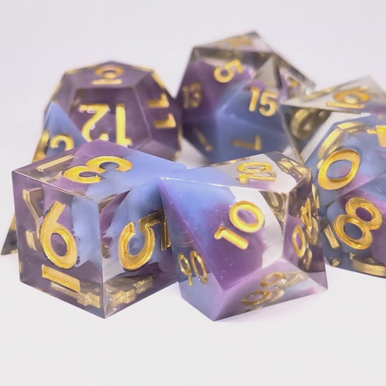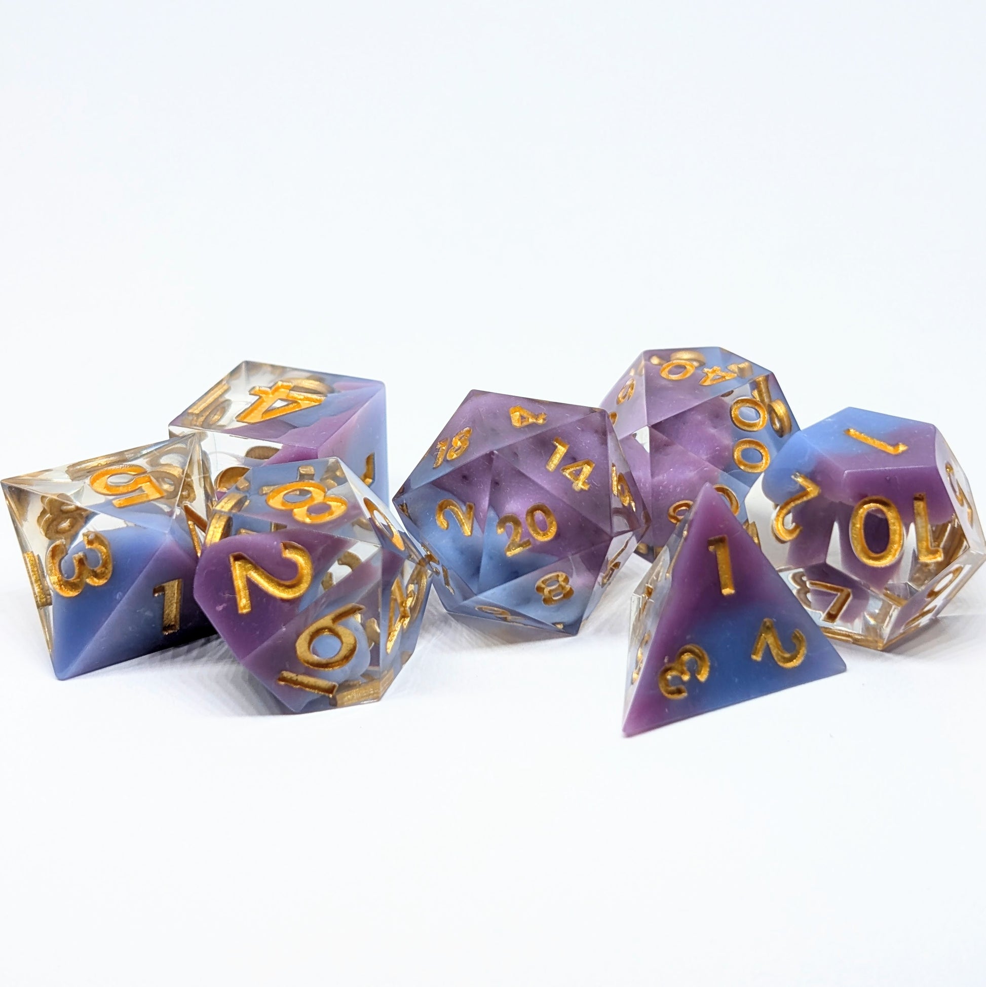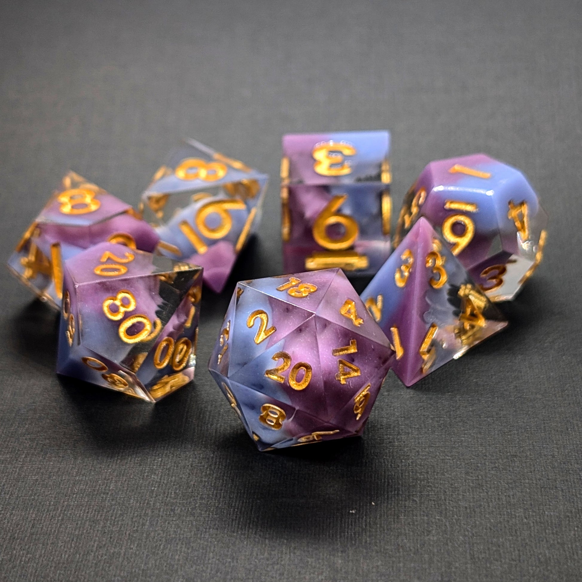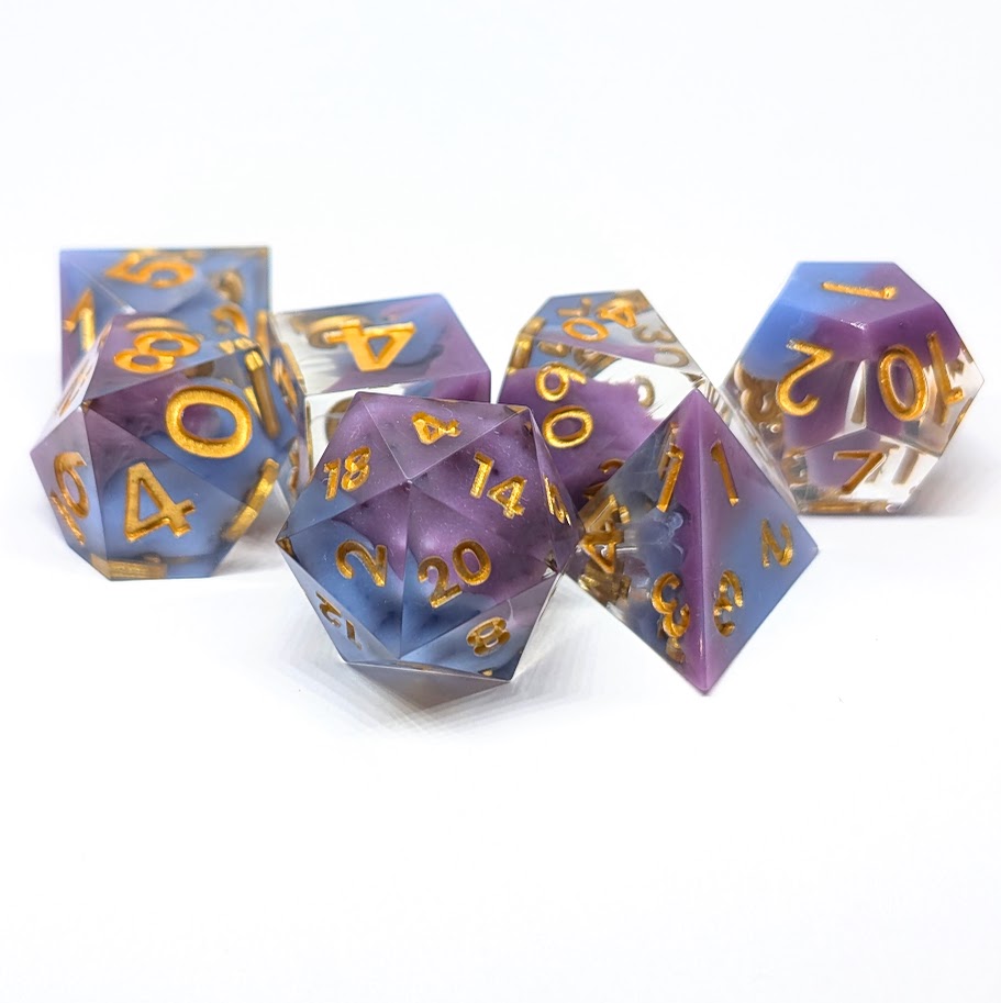 Resina cristalina con remolinos lilas y azules, terminada con números dorados que brillan como estrellas. Este set parece un pedacito de cielo, suave y mágico, listo para darle luz a tus tiradas.