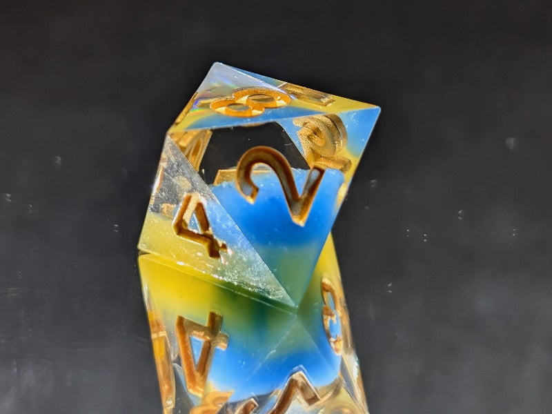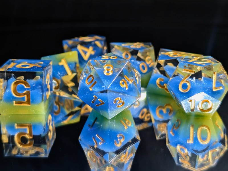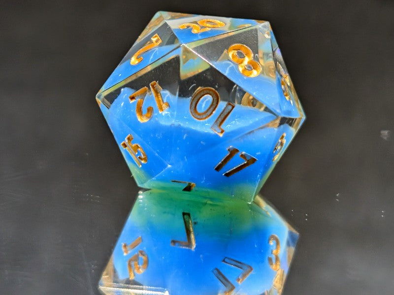 Set de 7 dados en resina totalmente transparente con masas azul y verdes encapsuladas como un slime viscoso atrapado en cada dado, evocando a las criaturas que acechan en las profundidades de antiguas mazmorras. Los números dorados metálicos, cuidadosamente pintados a mano, parecen sellar a la criatura dentro de su cubo cristalino.