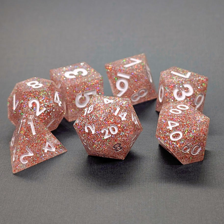 Resina rosa claro llena de glitter holográfico que estalla en todos los colores del arcoíris. Cada dado está vertido a mano en resina cristalina y terminado con números blancos, creando un set tan glamuroso como deslumbrante, listo para robarse el show en tu mesa.