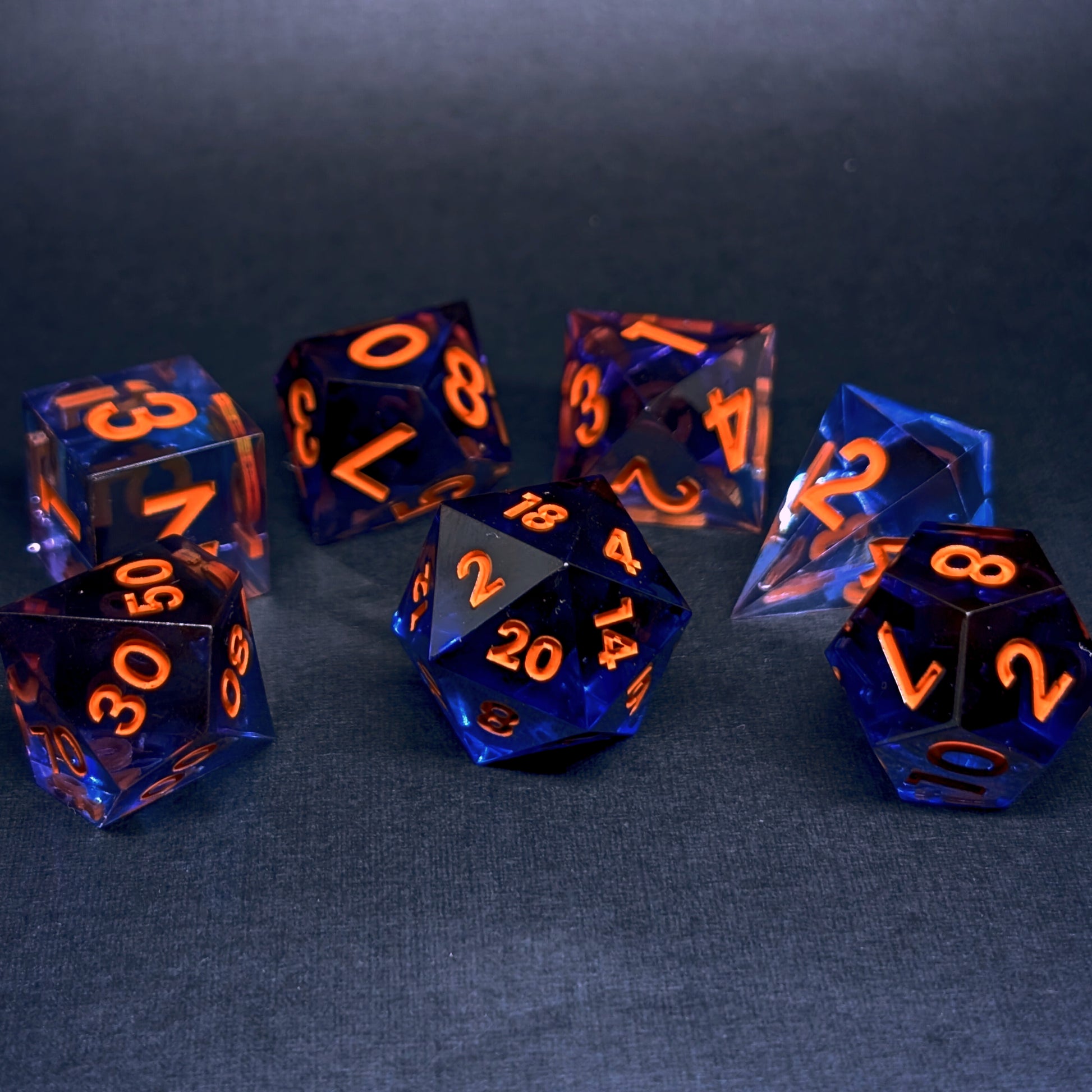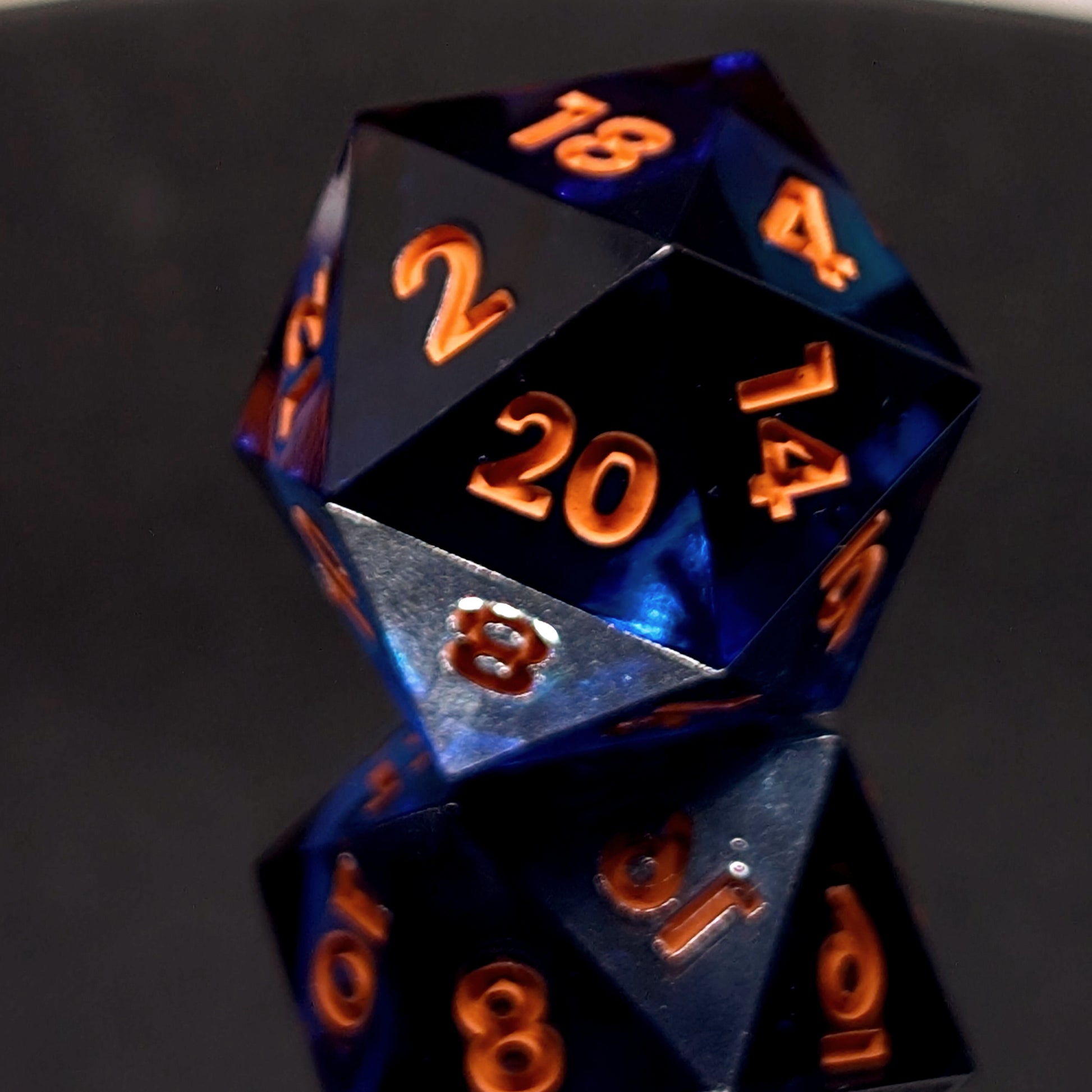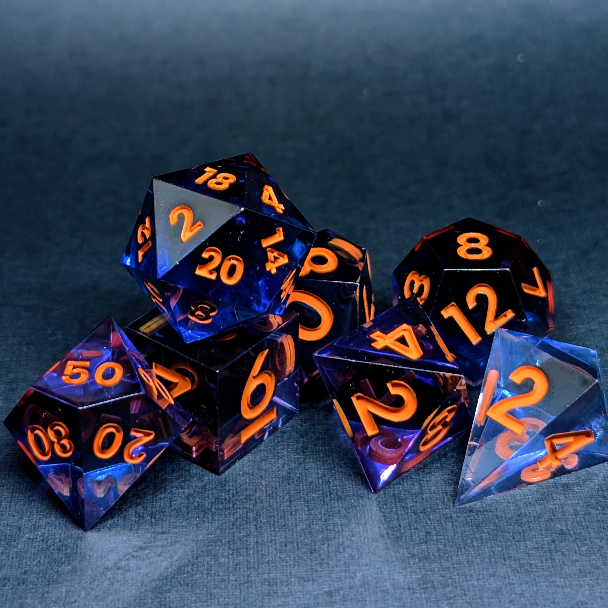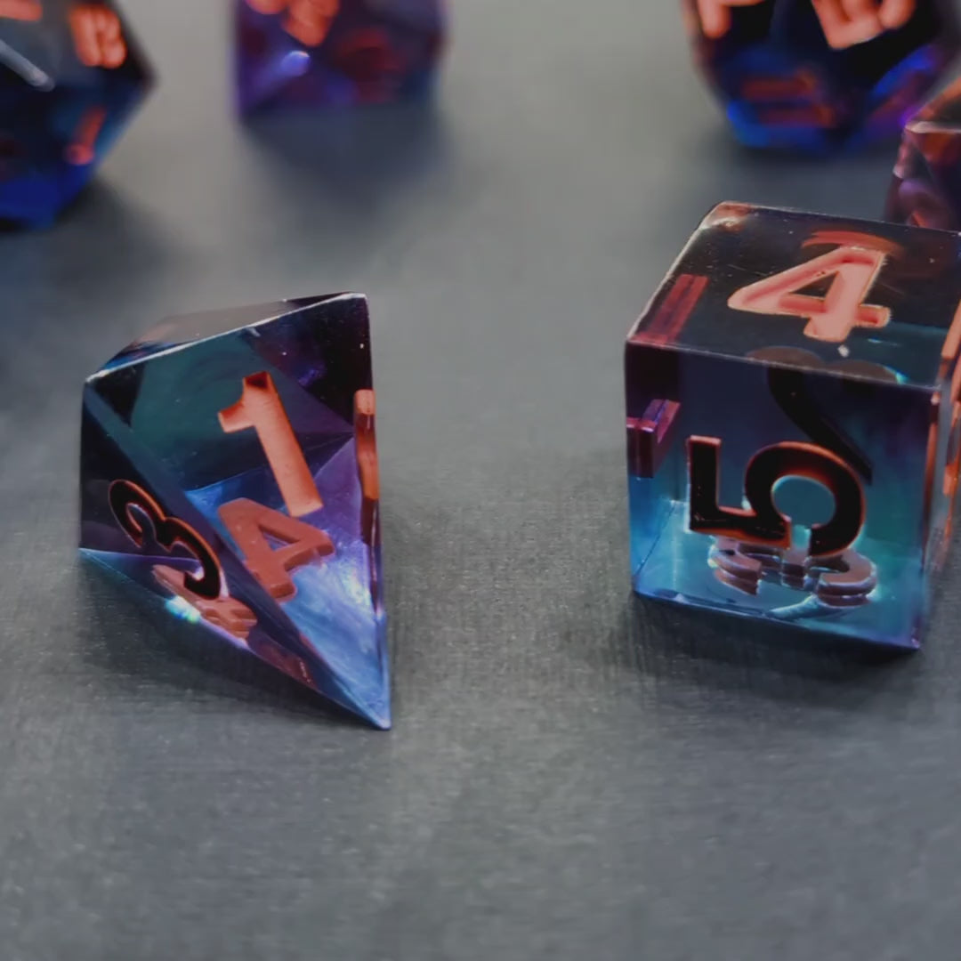 Vertido y pintado a mano, cada set lleva su propio hechizo, cada cara revela un tono distinto de morado o azul cristalino, reflejando los destellos naranjas de sus números. Un poco de luz de luna, una pizca de travesura en el caldero y un toque de encanto eterno para acompañarte en tus noches dulces o en tu campaña más hechizada.