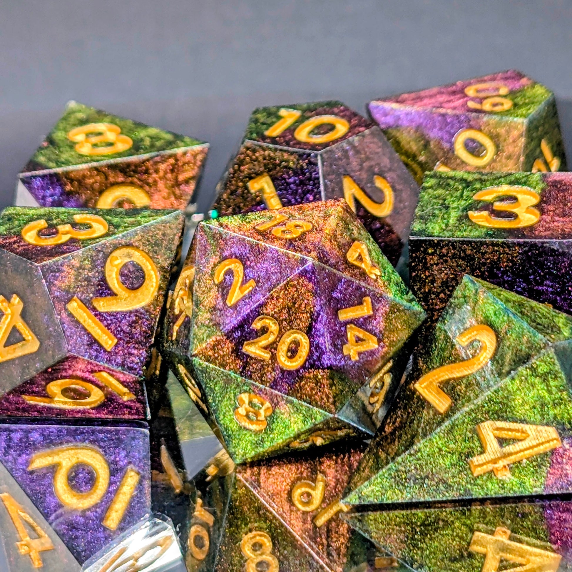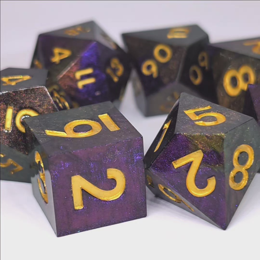 Morado profundo que se transforma en sombras oscuras y dorado que se enciende en verde según la luz! Este set cambia de rostro como un destino en movimiento. Karma brilla con un misterio cambiante, poderoso y enigmático, como si guardara secretos ocultos en cada cara.