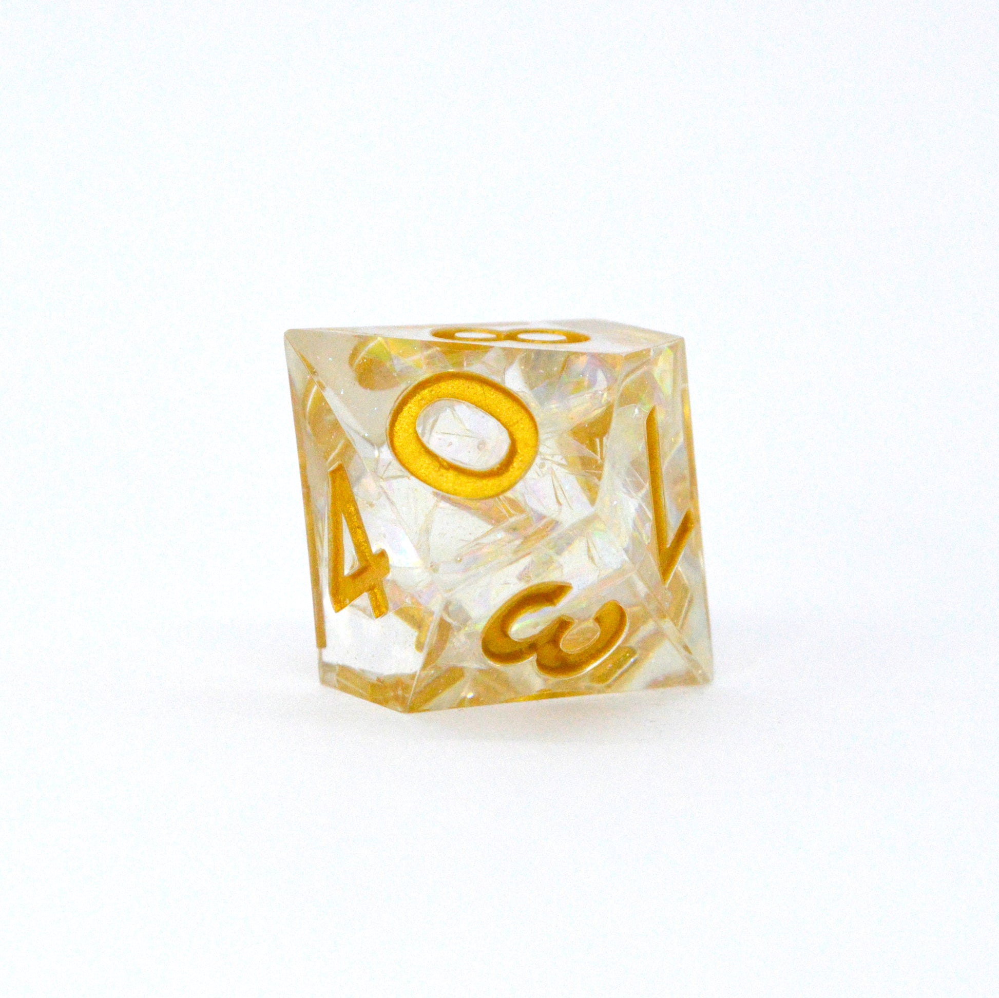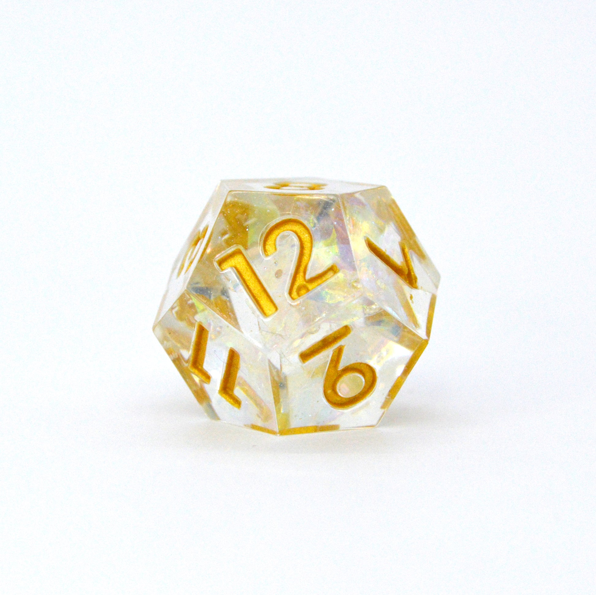 Radiance sets feature transparent or translucent resin with holographic light bending within them, making them appear to shine from the inside. These dice have been polished to perfection in order to better capture the effect within them, and are a great mixture between elegant and captivating, and will surely be a show-stopper at your table!